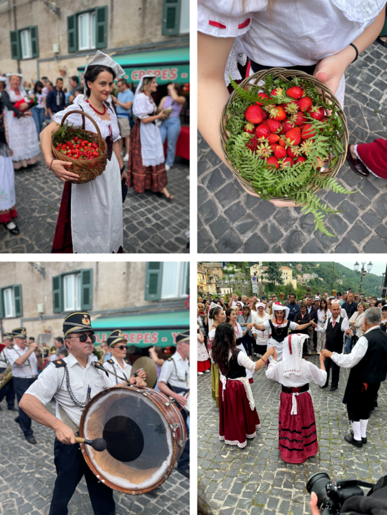 The village, with its main street bustling with life and cute side streets, seemed to brim with joyous energy. As I savored a divine strawberry treat, the lively rhythm of a marching band filled the air, parading past me not once, but twice! The procession featured locals in traditional folk costumes of the strawberry harvesters, proudly carrying baskets laden with the star of the festival: le fragoline di bosco.