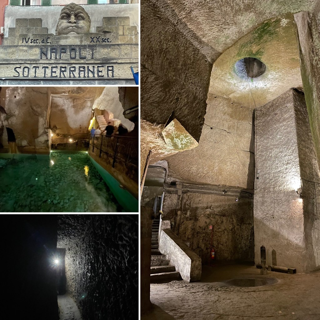 Left column has 3 photos. Top photo is the Napoli Sotterranea sign outside the main entrance. Middle photo is some of the water that remains underground. Bottom photo is one of the few narrow passageways through the underground experience. The column on the right is one of the large rooms that was carved out from the tufa with stairs.